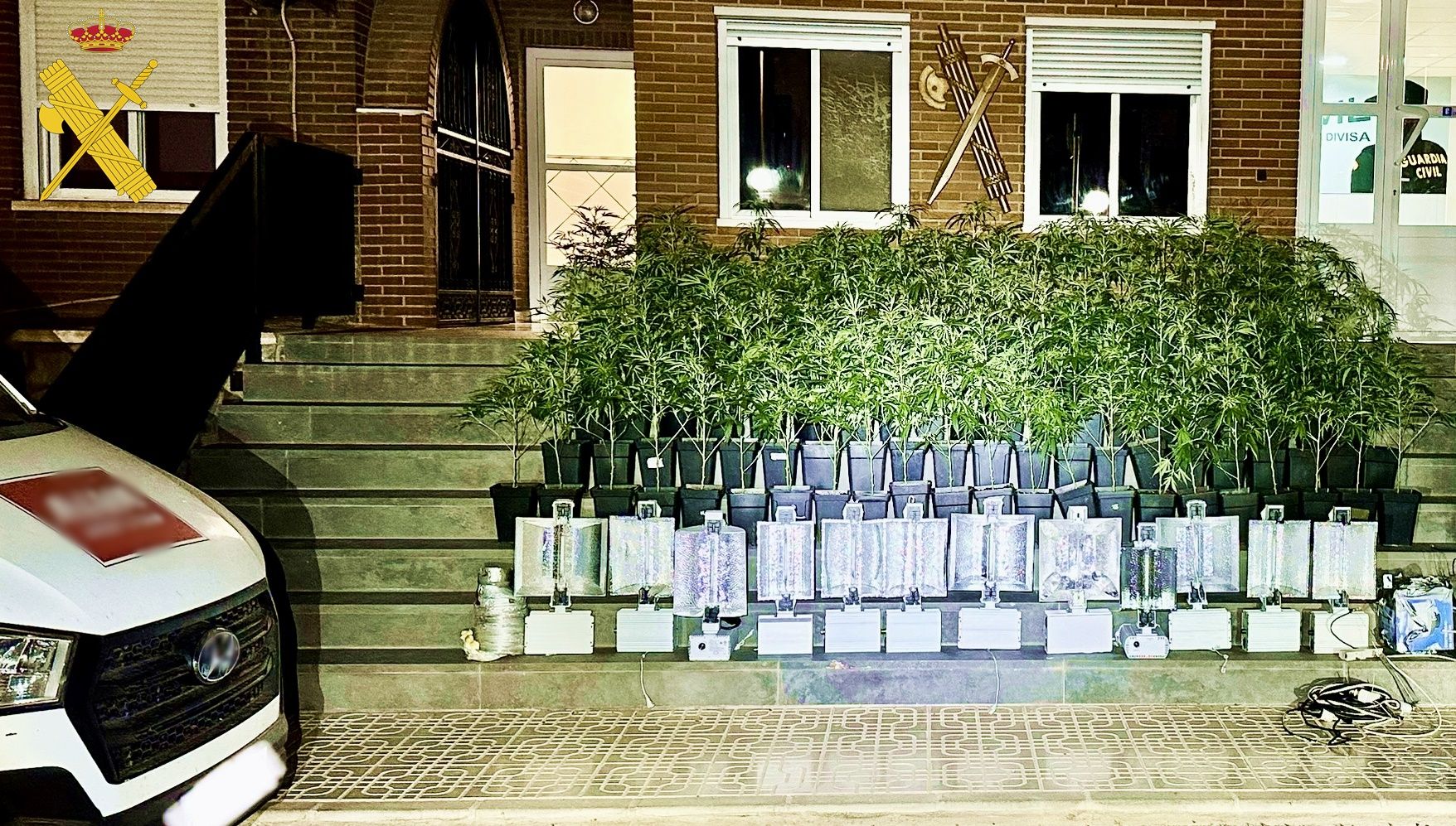 Al cabo de pocos minutos, las unidades desplegadas avistaron una furgoneta que coincidía con la descripción proporcionada por el ciudadano. Tras dar el alto al vehículo y detenerlo en el arcén, los agentes procedieron a la inspección del mismo e identificación de los tres ocupantes. Durante el registro, se hallaron en el interior un total de 102 plantas de marihuana, junto con 12 lámparas, 2 tubos extractores, 1 filtro de aire y diverso material eléctrico, elementos típicamente asociados al cultivo de esta sustancia.