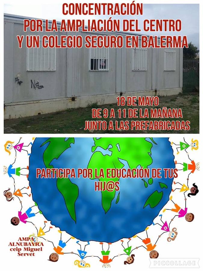 La AMPA Alnubayra del CEIP Miguel Servet de Balerma ha llamado a este núcleo ejidense a protagonizar y participar en la movilización prevista para mañana ... miércoles 18 de mayo, de 9 a 11 horas, junto a las aulas prefabricadas de este centro educativo balermero, con el objetivo de reivindicar la ampliación del centro y un colegio más seguro.