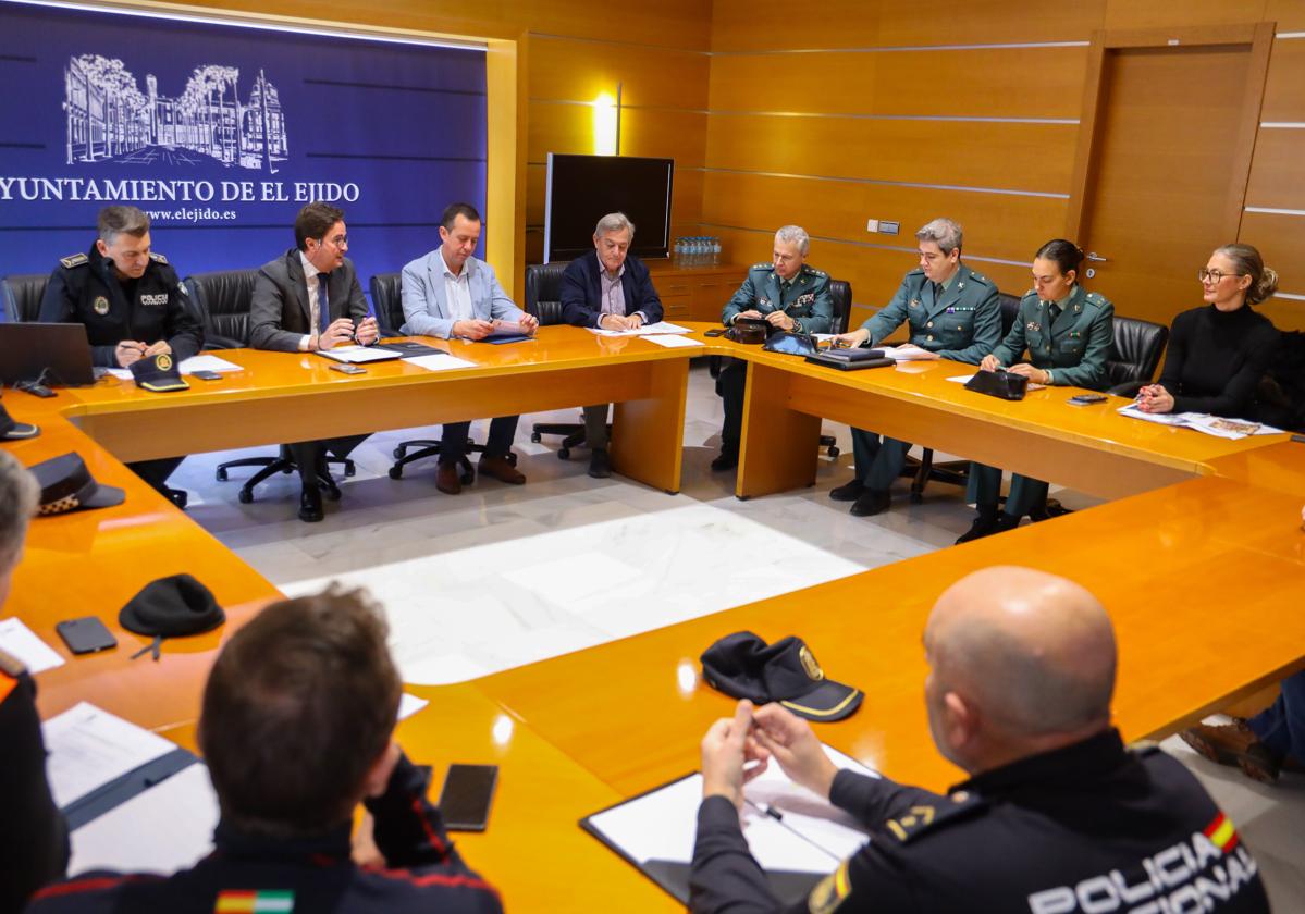 La sesión ha estado copresidida por el alcalde, Francisco Góngora y el subdelegado del Gobierno, José María Martín, junto al intendente jefe de la Policía Local, Marco Muñoz, así como el coronel jefe de la Comandancia de la Guardia Civil en Almería, José Antonio Carvajal; el comisario de la Policía Nacional en El Ejido, José Antonio Roca; el comandante de la Guardia Civil y jefe de la Tercera Compañía en El Ejido, Jesús Mira; la teniente del Puesto principal de la Guardia Civil en El Ejido, Irene Buján; el inspector de la Unidad Adscrita del Cuerpo Nacional de la Policía a la Junta de Andalucía, David de Frutos; el sargento del Consorcio de Bomberos del Poniente, Alejandro Raymond Maldonado; el coordinador de Protección Civil, Luis Prieto; el concejal de Obras Públicas, David Fernández; policías locales y técnicos municipales.