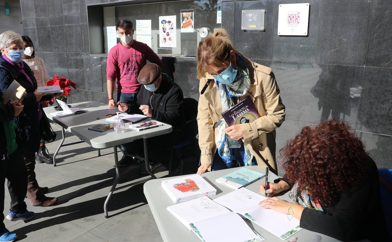 La entrada principal del Auditorio de El Ejido acogió en la mañana de este sábado la firma de libros de dos destacados ilustradores locales como ... el consagrado ilustrador y uno de los fundadores del 'Festicomic', Santiago Girón, con su obra policiaca 'Garrido, Música de barrio', y Carmen F. Agudo, con su trabajo 'Diario de una cuarentena ilustrada', que realizó durante el confinamiento.
