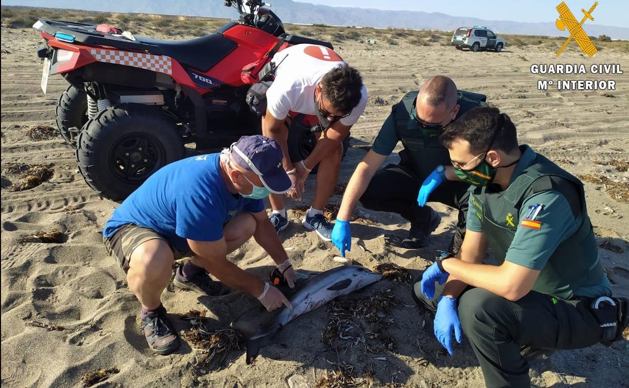 El pasado día 5, el Centro Complejo de Comunicaciones (C.O.S.) del 062, activaba la red de varamientos de Equinac, así como a agentes de la Guardia Civil de la comandancia de Almería al producirse el varamiento de un delfín, en la playa de Almerimar. Los agentes llegaron al lugar, una playa de difícil acceso en vehículo, y observaron cómo los técnicos de Equinac se encontraban examinando el cuerpo sin vida de delfín listado de 84 cm de envergadura, desarrollando tareas de seguridad y apoyo.