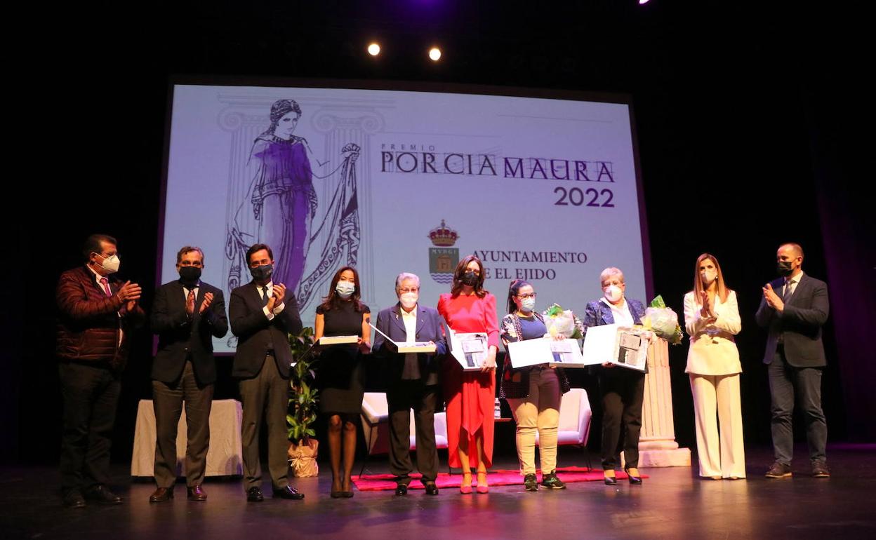 Así, arrancaba la entrega de los premios Porcia Maura, Las homenajeadas de este año fueron Francisca Lirola Maldonado, por su trayectoria personal como primera concejala de Servicios Sociales, concejalía que ella puso en marcha, además de crear también la Oficina de Atención al Consumidor, y su compromiso con el movimiento asociativo; a Amparo Cabrera Peláez, por su trayectoria personal como primera mujer concejala de la Corporación Municipal y primera Policía Local de El Ejido; a María Soledad Balaguer Gutiérrez, por su trayectoria profesional a favor de la igualdad al frente del Juzgado de Violencia sobre la Mujer; a María Adoración Martín Gómez, por su trayectoria personal a favor de la igualdad, formando parte importante de la asociación Renal del Poniente Almeriense (ARPA) y su trayectoria como doctora de Nefrología.