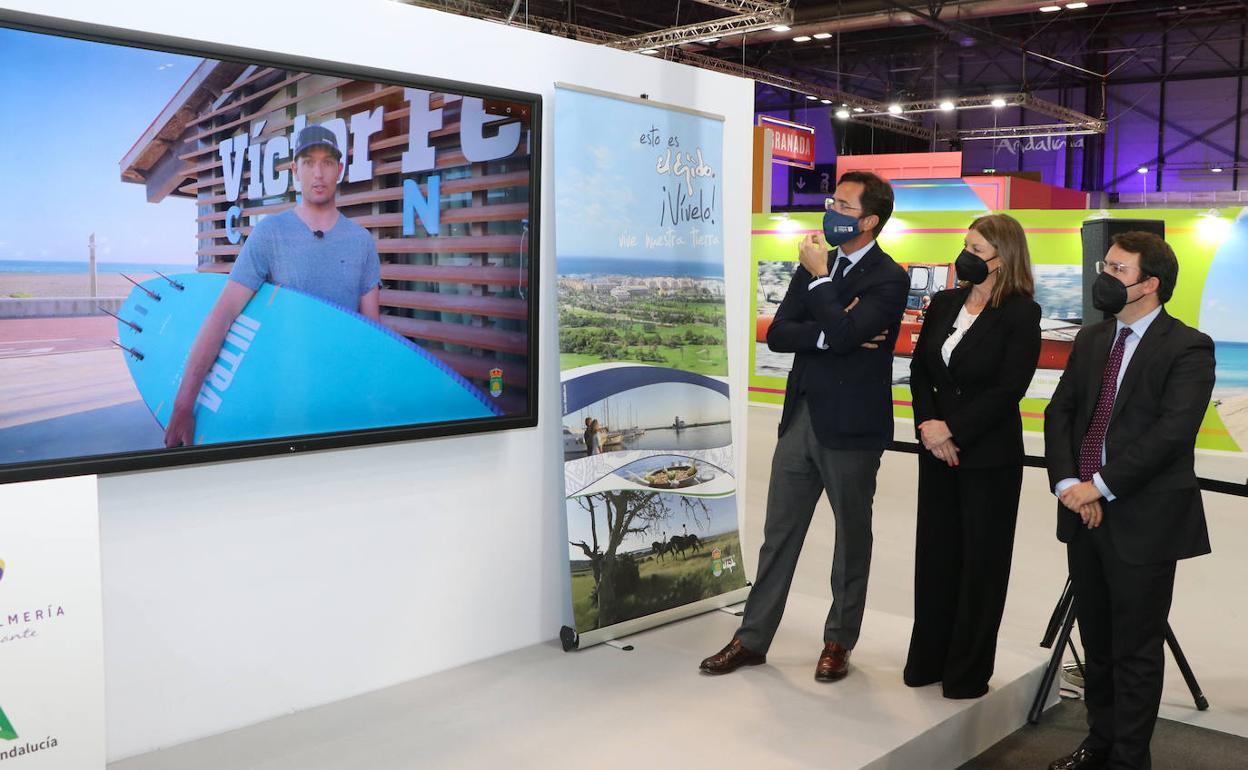 Durante el acto en el stand de Costa de Almería en IFEMA, se ha proyectado un video que ha mostrado el conjunto de actividades y experiencias de El Ejido a través de un guía turístico de excepción, el tricampeón del mundo de Windsurf, Víctor Fernández