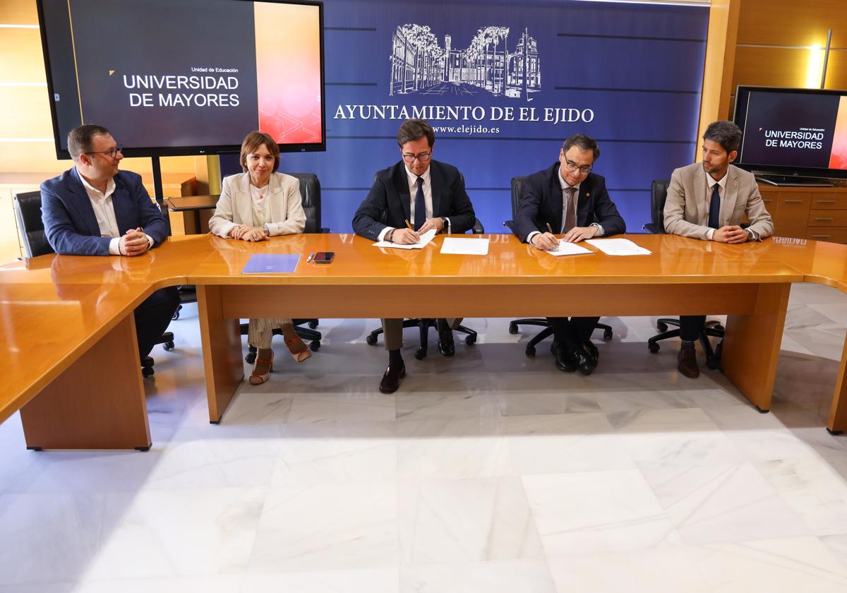El alcalde de El Ejido, Francisco Góngora, y el rector de la UAL, José Céspedes, han rubricado el acuerdo en un acto en el que también han estado presentes la vicerrectora de Cultura y Sociedad de la UAL, María del Mar Ruiz; el director de secretariado de la Universidad de Mayores, Antonio Codina; y el concejal de Educación, Javier Rodríguez.