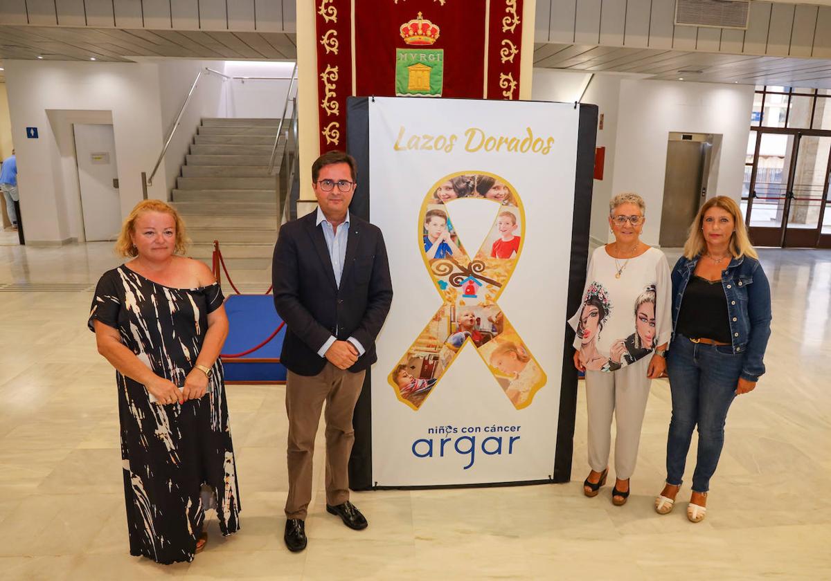 El alcalde, Francisco Góngora, y la edil María del Mar Martínez, mostraron durante el acto de colocación del lazo todo su apoyo a la asociación Argar, de familias de niños y adolescentes con cáncer de Almería, en un encuentro con su presidenta, Rosa María Onieva Amezcua.