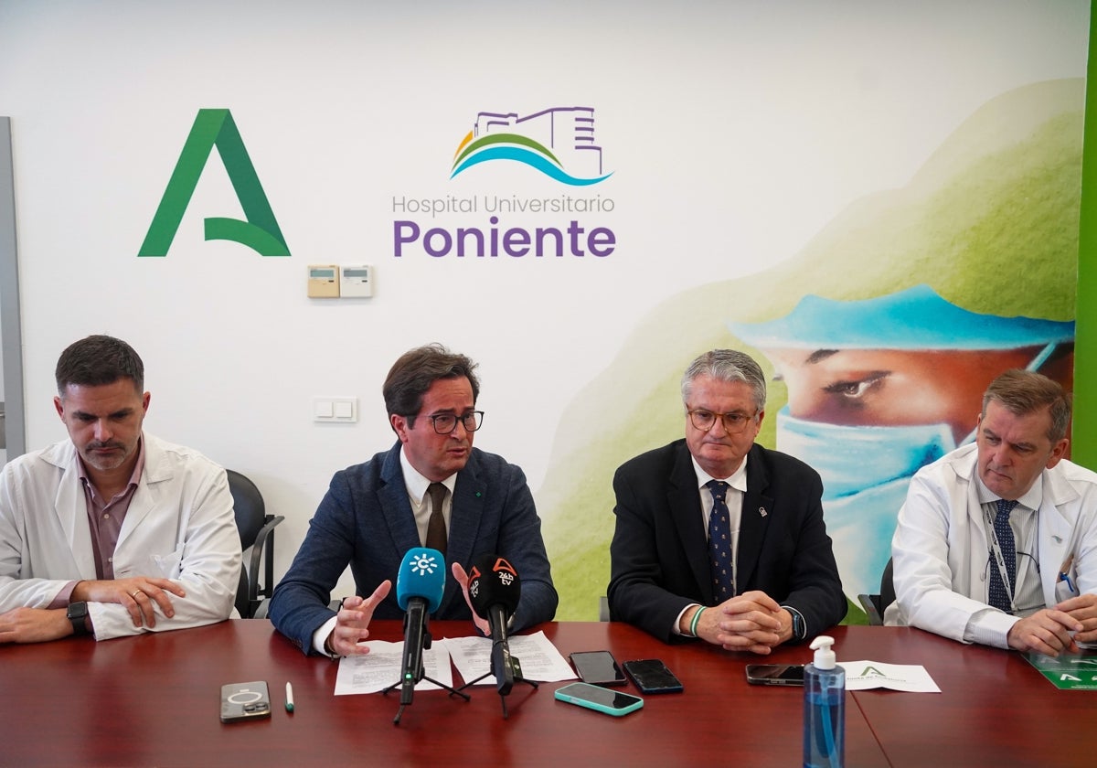 El delegado territorial de la Consejería de Sanidad en Almería, Juan de la Cruz Belmonte, ha informado hoy en rueda de prensa de este nuevo servicio, junto al gerente del Hospital Universitario Poniente, Pedro Acosta, el alcalde El Ejido, Francisco Góngora y el director Económico y de Servicios Generales del Hospital, David Hidalgo.