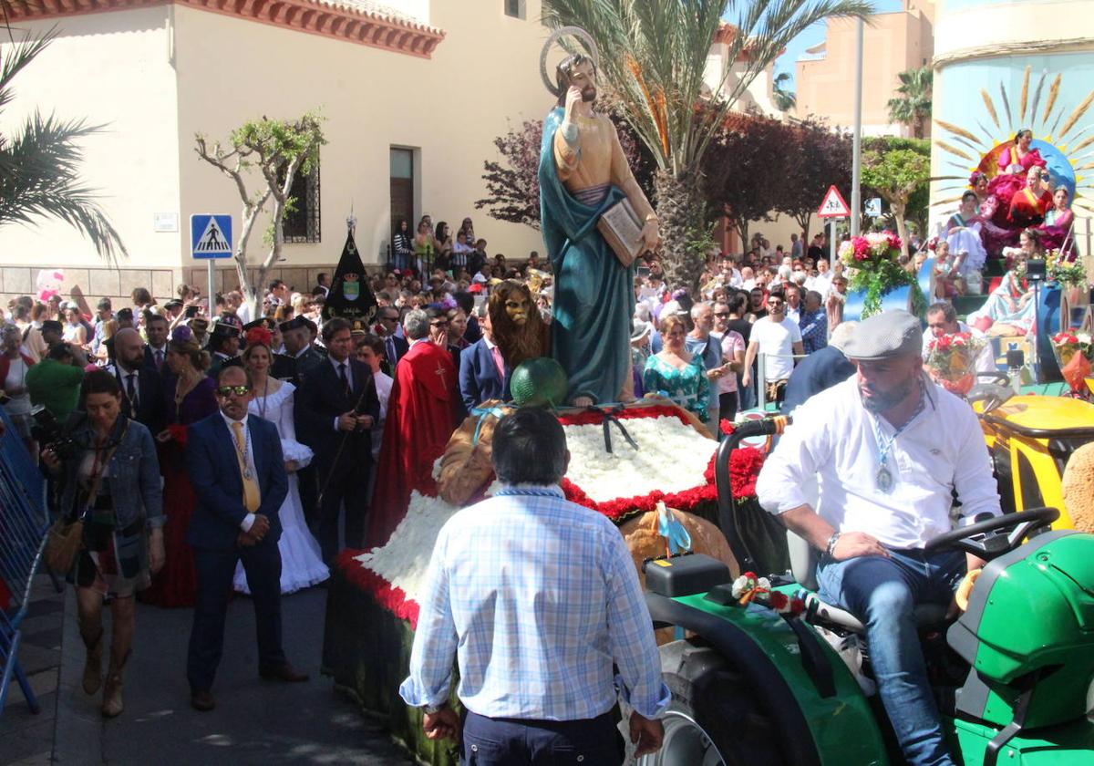 A las 10.30 horas arrancó la celebración de la misa en honor a San Marcos en la Iglesia de San Isidro Labrador, con la actuación del coro rociero 'Entre Acordes', y una hora más tarde, una gran traca anunciaba la salida del templo del Santo Evangelista, para dar inicio a la Procesión-Romería por las calles de la ciudad, encabezada por San Marcos, y acompañada por la Agrupación Musical Cristo del Amor, la Banda de Cornetas y Tambores de la Flagelación y Gloria de Elche y la Banda Sinfónica de El Ejido, además de cuatro mujeres ataviadas con el traje típico del municipio.