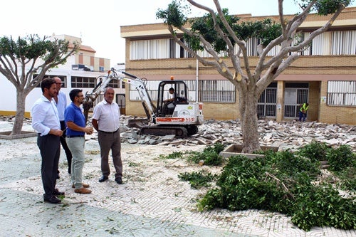 El alcalde de El Ejido, Francisco Góngora, que, junto al concejal de Obras Públicas, Mantenimiento y Servicios del Consistorio, José Andrés Cano, visitó estos días la obras para comprobar el avance de las mismas, y destacó la importancia del proyecto que «vendrá a mejorar no sólo la imagen de la plaza, que se encontraba en muy mal estado debido a la entrada de camiones a la zona, sino a evitar también los problemas de acumulación de agua que tanto dificultaban a los alumnos como al personal docente el acceso al centro educativo».