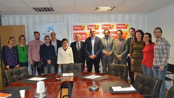 En la firma estuvieron presentes Jesús Barranco, director general de Alhóndiga La Unión; Juan Ignacio Zafra, director territorial de Caixabank en Andalucía Oriental; y María Luisa Martín, presidenta de la Asociación Noesso.