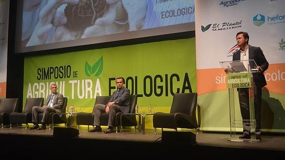 El I Simposio de Agricultura Ecológica en Invernaderos que se está celebrando en El Ejido, en el Auditorio Municipal, con la participación de más de ... 500 profesionales que abarrotan la sala principal, durante las diferentes ponencias, está profundizando en las bases de los cultivos orgánicos bajo abrigo, sistema que predomina en Almería, y sobre el que se está desarrollando la implantación progresiva de este tipo de agricultura. Si hace apenas 10 años «la utilización de técnicas de control biológico para luchar contra las plagas apenas se utilizaban, y los productores pensaban que no se aplicaría, y vemos hoy como se extienden por este campo, quien sabe si en 2020, la agricultura ecológica bajo abrigo ocupe el 25% de la superficie», comentó Roberto García Torrente, director de Negocio Agro alimentario de Cajamar, durante la inauguración del Simposio, honor que compartió junto al alcalde de El Ejido, Francisco Góngora y el gerente de Coexphal, Luis Miguel Fernández. Almería se encamina así a una nueva 'revolución', tal y como ocurriera con el control biológico.