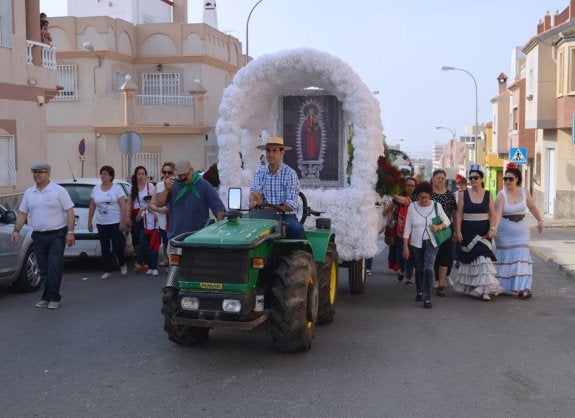 Si hay una cualidad que define a los vecinos del núcleo ejidense de Santa María del Águila es su participación y su forma de involucrarse ... en todas y cada una de las actividades que durante todo el año se dan cabida en esta población de El Ejido. Y su Romería del Águila es una de sus fechas más señaladas y esperadas. Por eso, durante la jornada de ayer domingo, decenas de vecinos se vistieron de rocieros y engalanaron sus carrozas para acompañar a su patrona, la Virgen María Madre de la Iglesia, por su recorrido hasta el Paraje El Águila, para disfrutar de una jornada religiosa y de convivencia entre amigos y familiares.