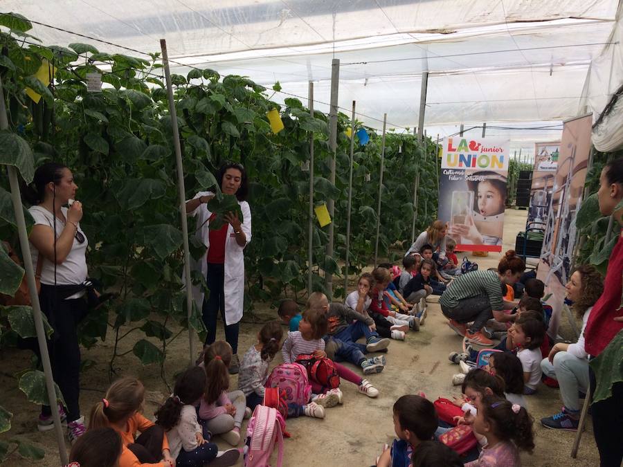 Así, los pequeños pudieron disfrutar de un recorrido guiado, en el que pudieron conocer cómo se cultiva el pepino en el invernadero, y todos los entresijos de la agricultura y principal sistema productivo de la provincia, y especialmente, de la comarca del Poniente. De igual modo, La Unión Junior estuvo presente durante toda la visita, y Ana Menchón, del departamento técnico de Alhóndiga La Unión, fue la encargada de explicar a los estudiantes de qué se alimentan las plantas, cómo realizan la fotosíntesis, y cómo se desarrollan.