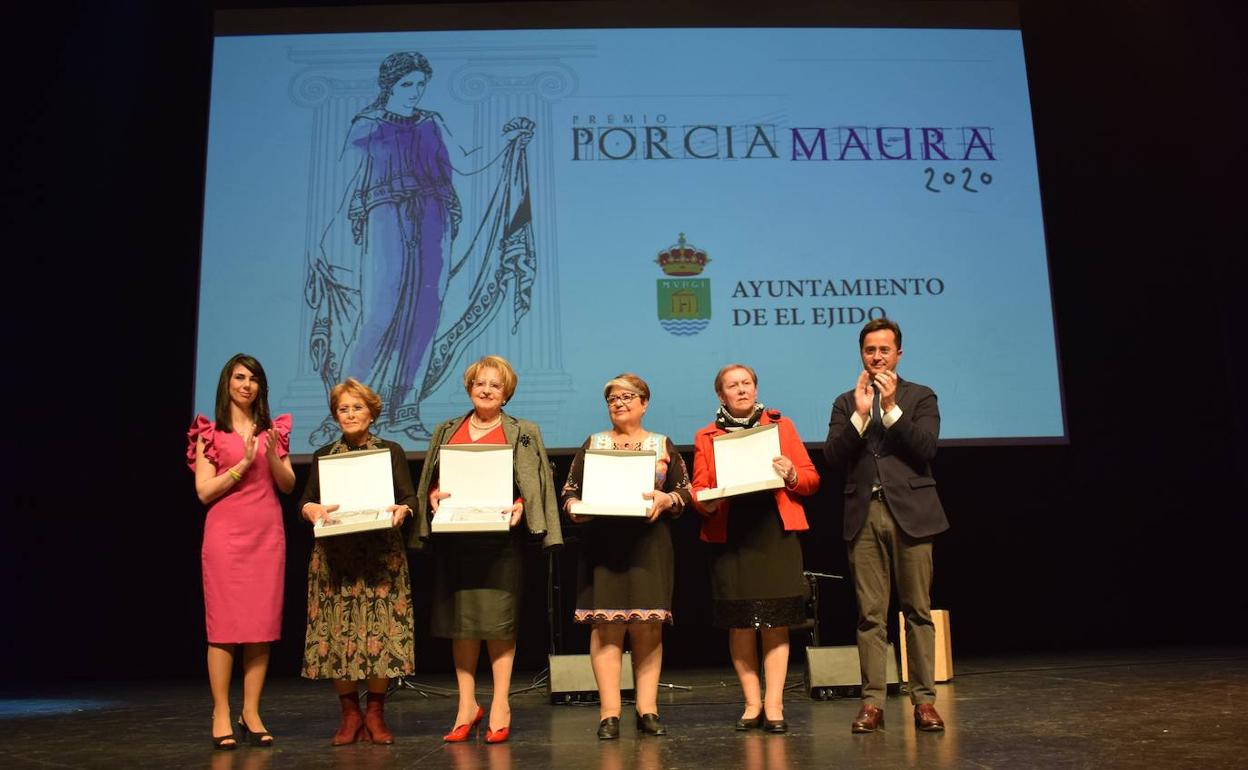El Ayuntamiento de El Ejido entregó anoche en el Teatro Auditorio los premios Porcia Maura. Una edición que en esta ocasión permitió rendir homenaje a ... cuatro relevantes mujeres como son Antonia Ferrer Sánchez, Rosario Martín Maldonado, Carmen Sánchez Carvelo y Rosalía Luque Palmero, que, con su trabajo, esfuerzo y dedicación, han contribuido de una manera importante al desarrollo del municipio a lo largo de las últimas décadas.