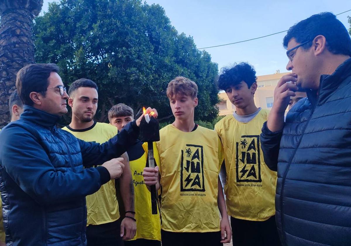 Poco después de las 17 horas, en la Plaza Antonio Mira de El Ejido, como viene siendo tradición, el alcalde de El Ejido,Francisco Góngora, encendió el fuego de la antorcha para que los portadores, en torno a una quincena de jóvenes del municipio, de la asociación Ajusa, de entre 13 y 19 años, fueron los encargados de llevarla hasta San Agustín, corriendo y mediante relevos.