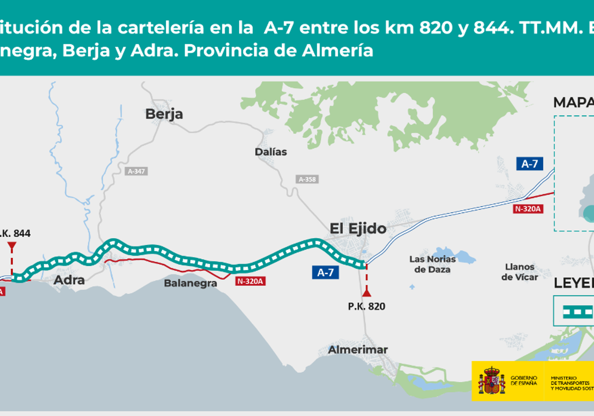 El Ministerio de Transportes y Movilidad Sostenible adjudicó por un importe de 322.601,33 euros (IVA incluido) el contrato de obras para la sustitución ... de la cartelería existente en la autovía A-7 entre los enlaces situados en los kilómetros 820 y 844, a su paso por los municipios de El Ejido, Balanegra, Berja y Adra, en la provincia de Almería.