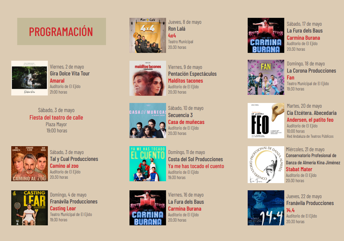 La primera de las grandes obras de sala programadas en este 48 Festival Internacional de Teatro de El Ejido será 'Camino al Zoo' el 3 de mayo; a la que seguirán 'Casting Lear', el domingo 4 de mayo; '4x4' de Ron Lalá el jueves 8; 'Malditos Tacones' el viernes 9; 'Casa de Muñecas' el sábado 10; 'Ya me has tocado el cuento' el domingo 11; 'Carmina Burana' de la Fura dels Baus el viernes 16 y sábado 17; 'Fan' el día 18; 'Stabat Mater' el miércoles 21; '14.4' el jueves 22; 'Una madre de película' el viernes 23; 'Los cuernos de Don Friolera' el sábado 24; 'Entregamos de Manu Sánchez' el domingo 25; 'Chipi La Canalla: el bar nuestro de cada día' el jueves 29; 'La piel fina' el viernes 30; y 'Loser The Show' el sábado 31 de mayo.