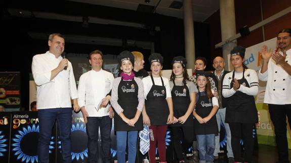 Como si de auténticos chefs se tratasen, Gema, Víctor, Naomi, Sofía, Lucía e Iratxe echaron el resto y arriesgaron con sus platos para lograr hacerse un hueco en el podio de vencedores. La final más esperada dentro de Almería Gourmet arrancó a las 12.30 horas desde la Sala B del Auditorio de El Ejido, ante la gran expectación de los padres y familiares de los pequeños, así como de quienes quisieron acompañarles en el momento más decisivo de esta edición de Minichef, para el que contaron con un tiempo de preparación de 45 minutos. Una falsa lasaña con sardina marinada que elaboró Gema, el pollo con manzana, cebolla y salsa de soja de Víctor; el timbal de verduras con ternera y crema de tomate de Naomi -tercera clasificada de la pasada edición de Minichef-, el pollo al ajillo de Sofía con palitos de calabacín; el pimiento relleno de verduras y setas de Lucía, y la dulce armonía entre mar e invernadero de Iratxe, se llevaron numerosos elogios por parte del jurado, compuesto por Mariela Pérez y su equipo de Tu Chef Talleres, Antonio Carmona, de Terraza Carmona, y el chef Michelin ejidense y anfitrión de Almería Gourmet, José Álvarez.