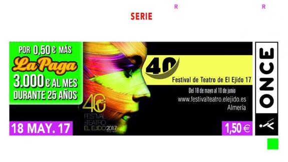 Cinco millones y medio de cupones llevan como fondo la imagen oficial del Certamen y la fecha de su celebración, del 18 de mayo al 10 de junio, con la leyenda 40 Festival de Teatro El Ejido 17. La ONCE quiere poner el foco así en toda España, a través de su red de ventas, un Festival que se ha consolidado en estas cuatro décadas en un referente principal y un revulsivo de la cultura en la provincia de Almería, en palabras del director de la ONCE en la provincia.